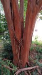Nonetheless, being a skilled horticulturist, Ray made an excellent choice. Unlike other cultivars whose pink or purple flowers would have offended my color sensibilities as they clashed with our cinnamon-colored exterior, the creamy-white blossoms of the stately Natchez create a harmoniously floriferous cascade each summer. But the brilliance of Ray’s choice is most apparent in the fall. For it is then that the annual process of exfoliation occurs.