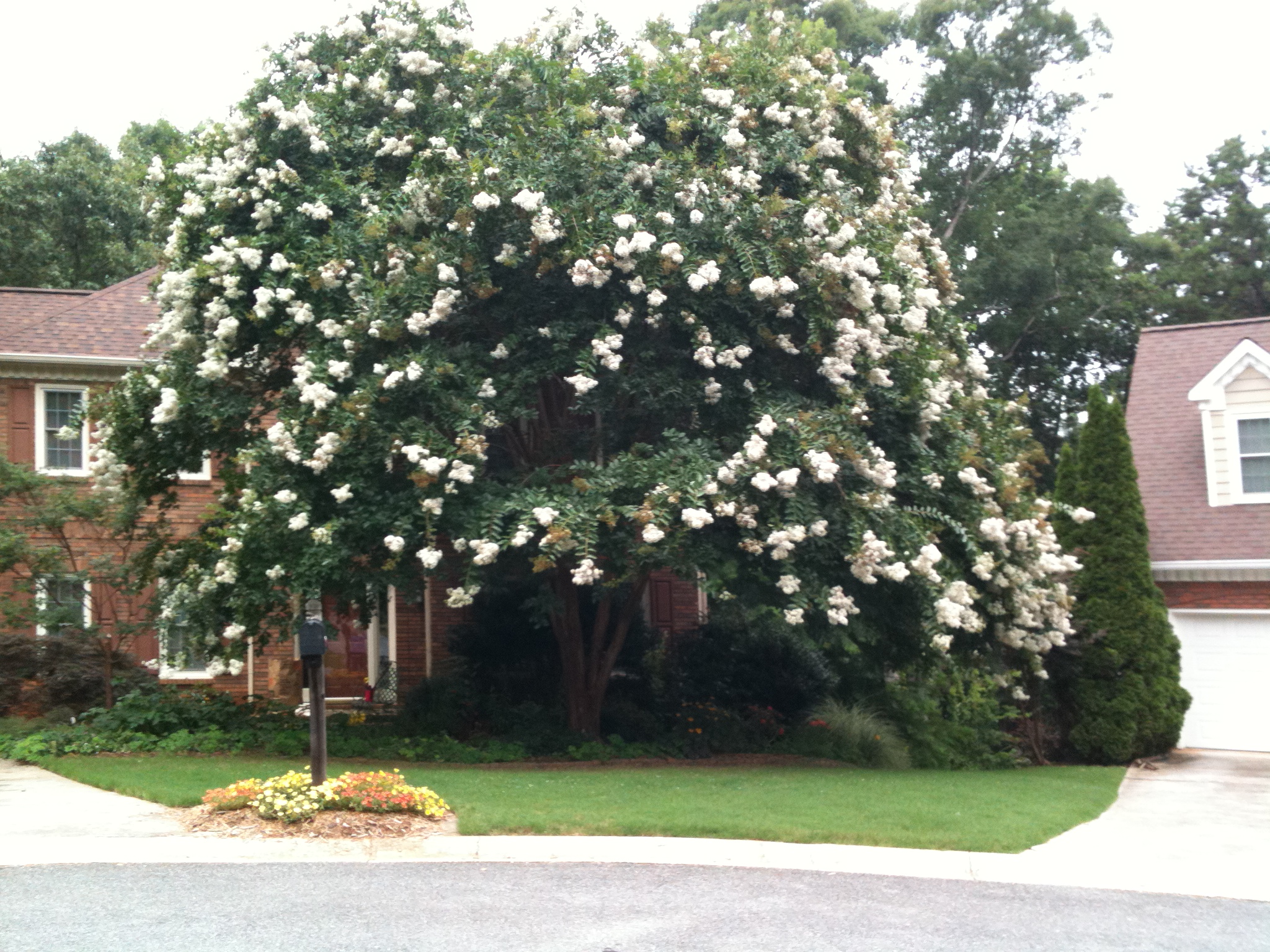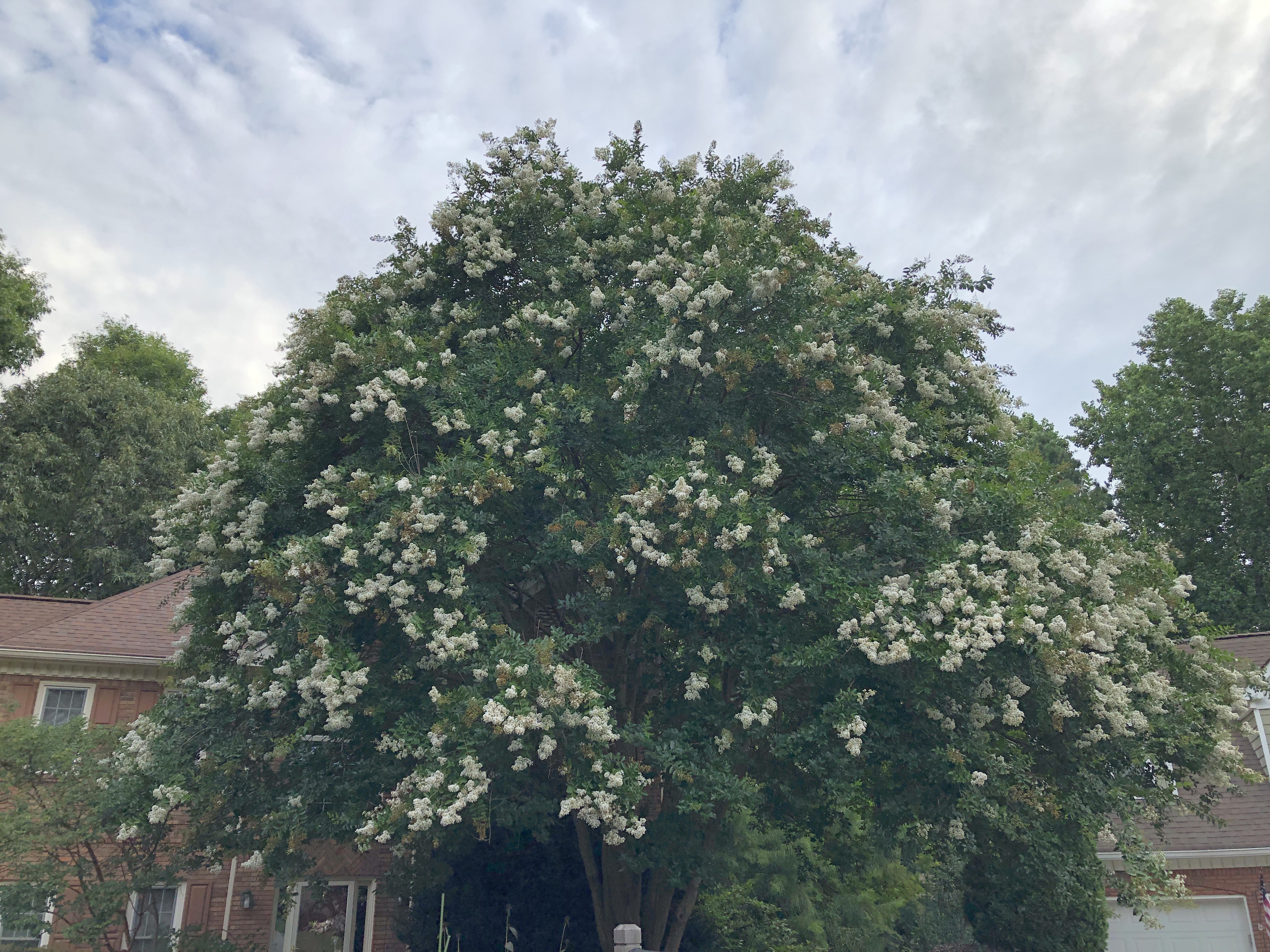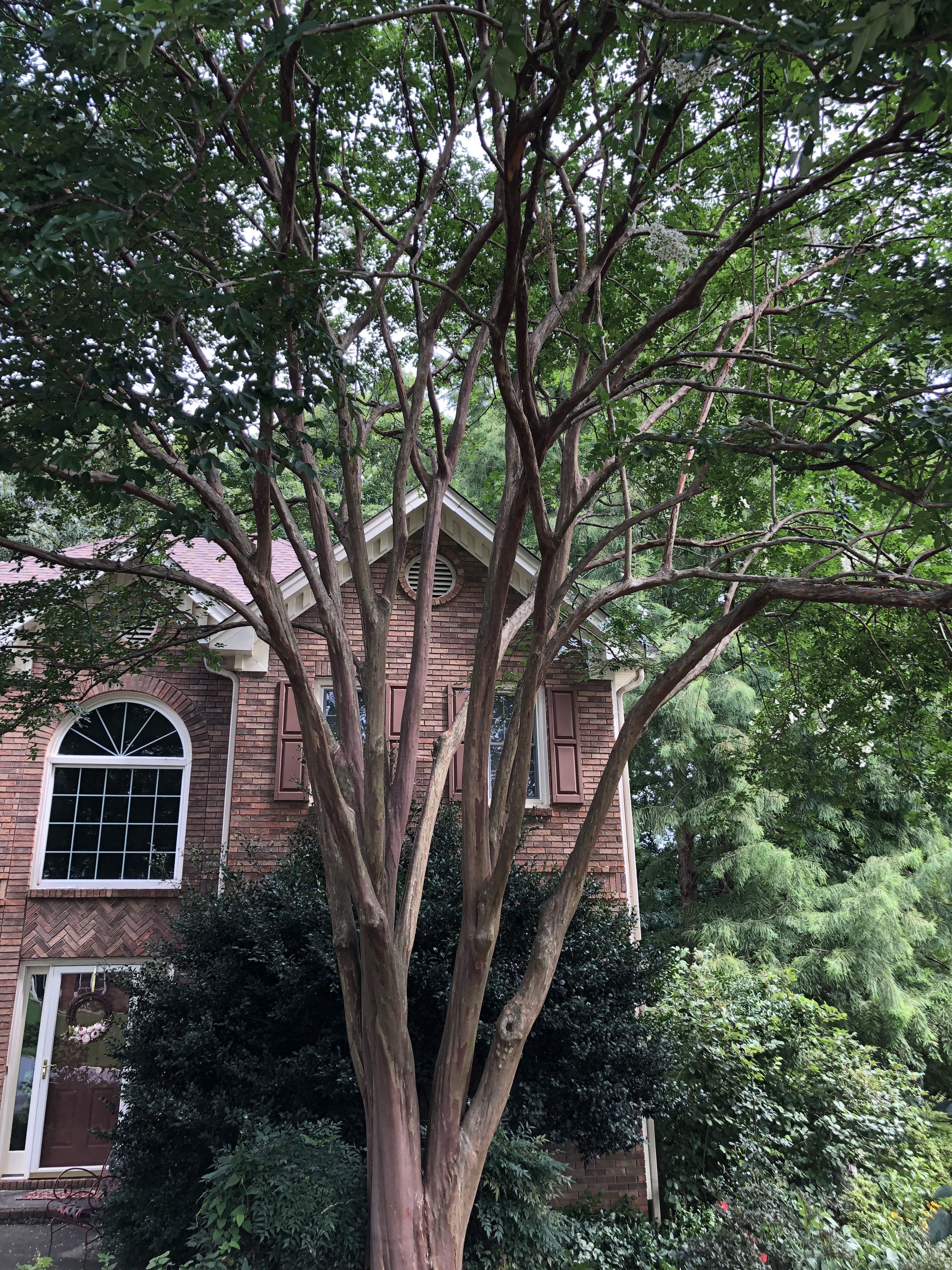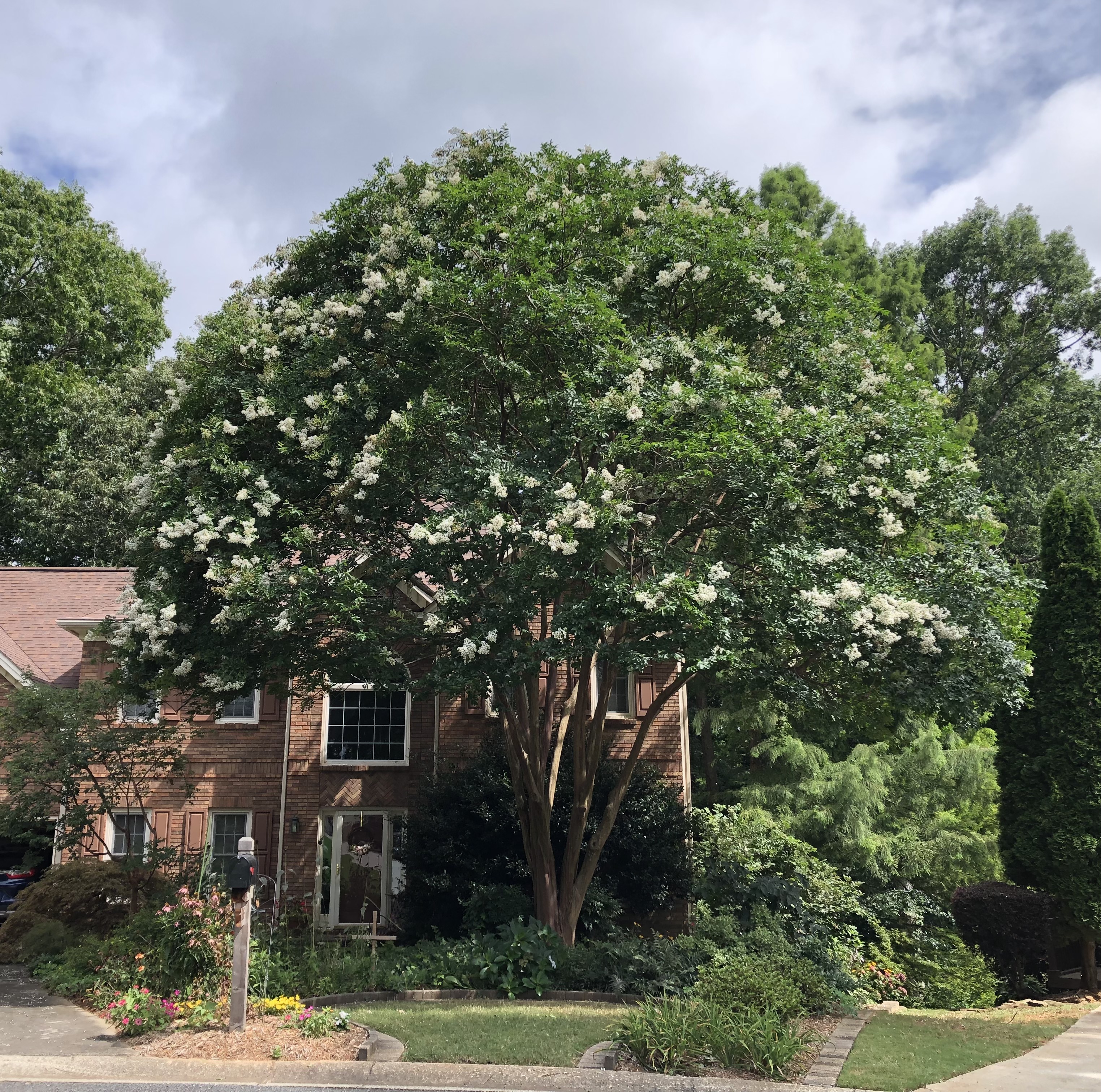 The stately ‘Natchez’[2] was a mere toddler when Ray planted it over 25 years ago. It now reaches the roofline of my two-story house, and its canopy is almost as wide as the tree is tall. My neighbors have been patient with branches that grew over the property line, only to drop tiny white blossoms on their driveway each summer. But, alas, they received a letter from our HOA about a related matter, which led them to kindly request that I have the offending limbs removed.