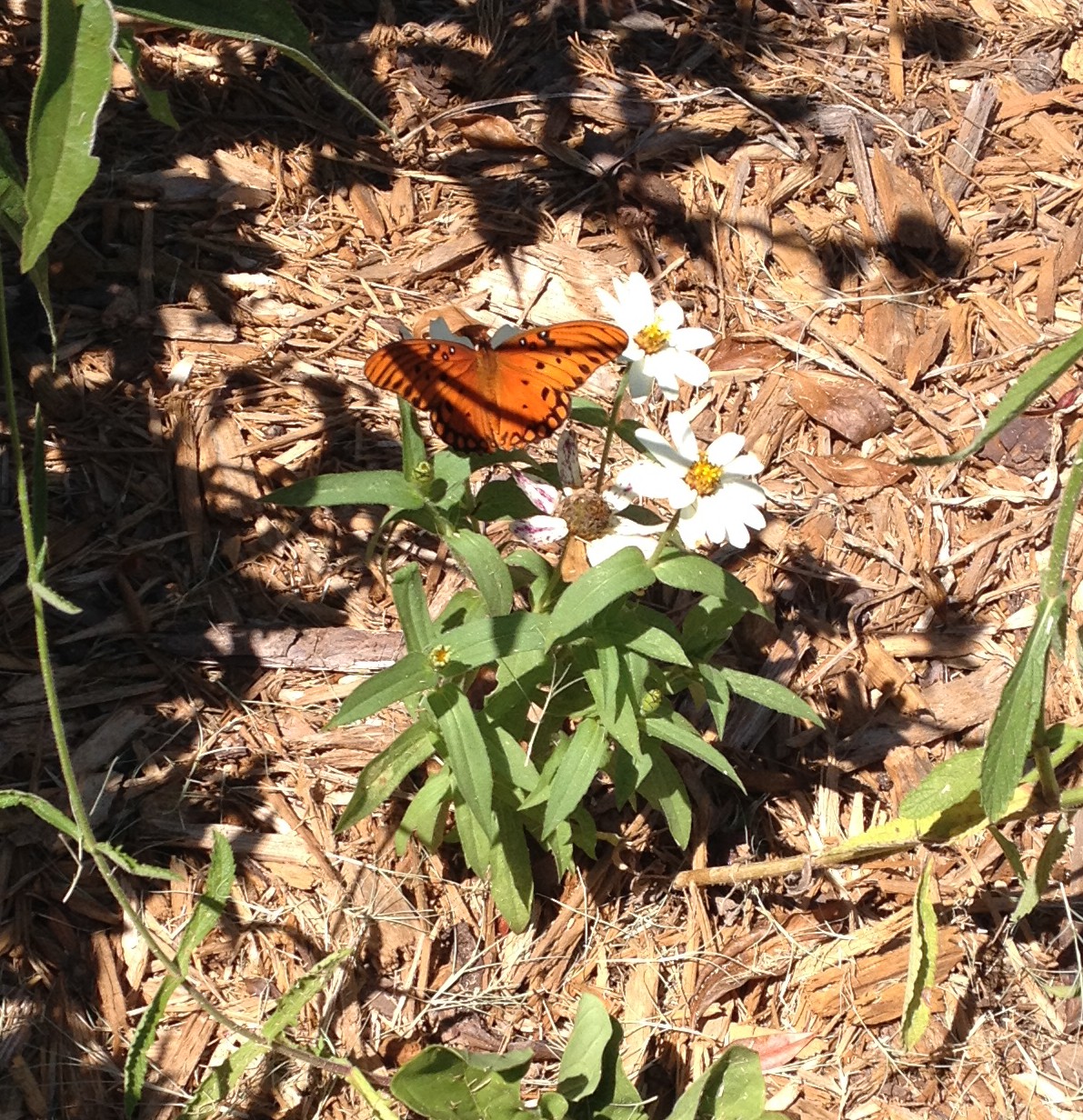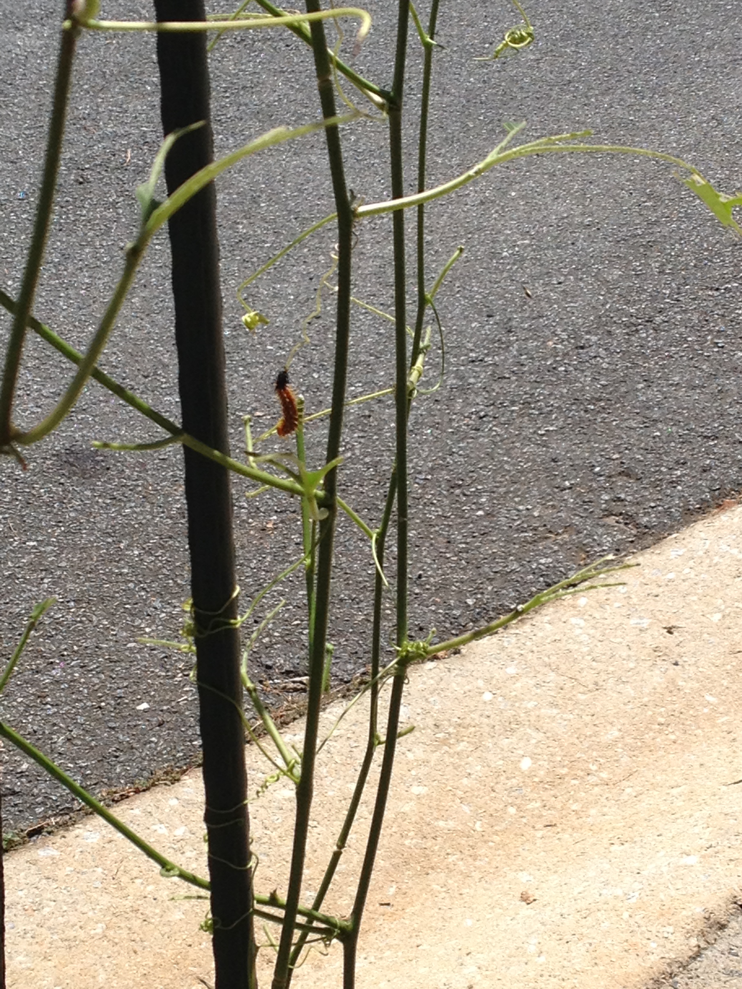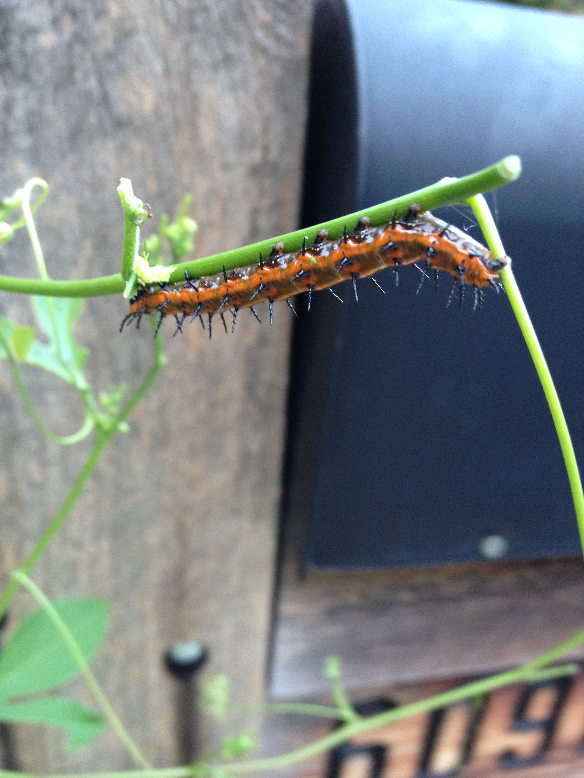 My time outside was drawing to a close when I pulled up a spent summer annual, revealing a spindly bit of passionflower vine with a solitary gulf fritillary caterpillar munching intently on a bedraggled leaf. My heart soared! I’d been hugged.