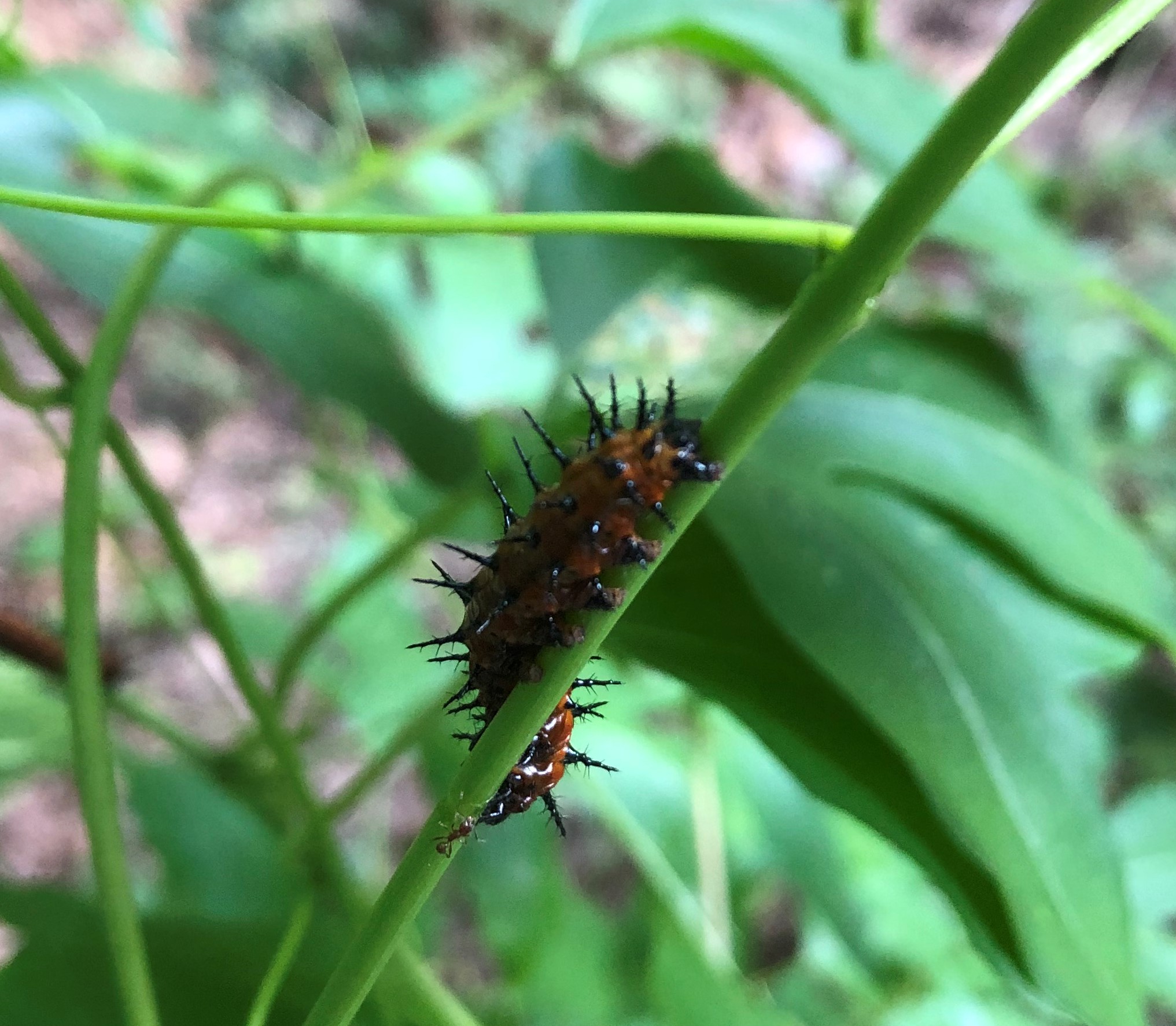 I kept up my twice-daily vigil, hoping there would eventually be enough caterpillars to satisfy the wasps and still leave some to make it through their life cycle. Days passed with only an occasional sighting. Then I realized there was an army of ants busily traversing the sprawling vines. Back to Google. “Do ants eat caterpillars?” Yes, they do. By this time, my anticipation at getting to watch wave after wave of caterpillars reach maturity on my vine had given way to despair since I doubted it would be possible to get rid of the ants without negatively impacting the caterpillars.