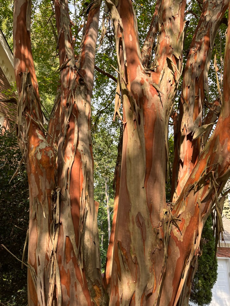 Even so, being a skilled horticulturalist, Ray made an excellent choice. Unlike other cultivars whose pink or purple flowers would have clashed with our cinnamon-colored exterior and offended my color sensibilities, the creamy-white blossoms of the now-stately Natchez create a harmoniously floriferous cascade each summer. But the brilliance of Ray’s choice is most apparent in the fall, for it is then that the annual process of exfoliation occurs.